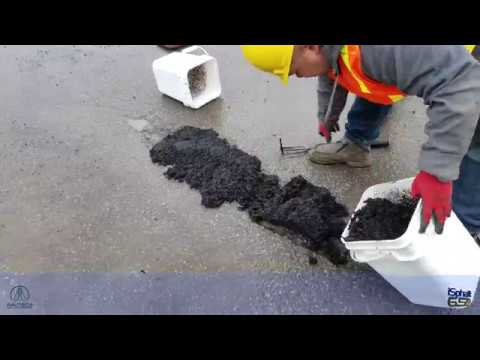Patched a pothole in winter directly in water, 4 months later, toughness and strength test by pounding a 4 pounds mass on the conventional asphalt and on the iSphalt 6.5 patch several times. Colmaté un nid-de-poule en hiver directement dans l'eau, 4 mois plus tard, PAVTECH a effectué un test de dureté et de résistance en utilisant une masse de 4 livres, des coups de masse ont été donnés sur l'asphalte conventionnel et sur la réparation de iSphalt 6.5.