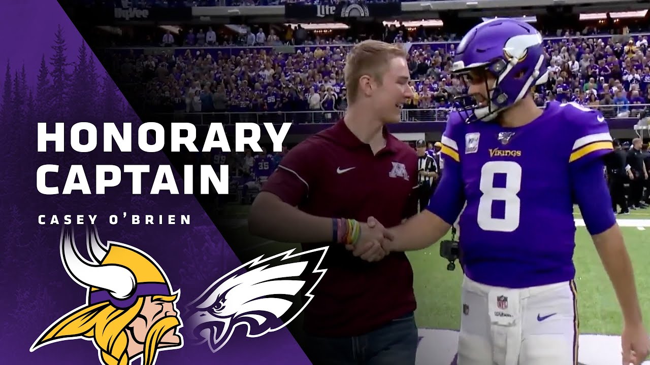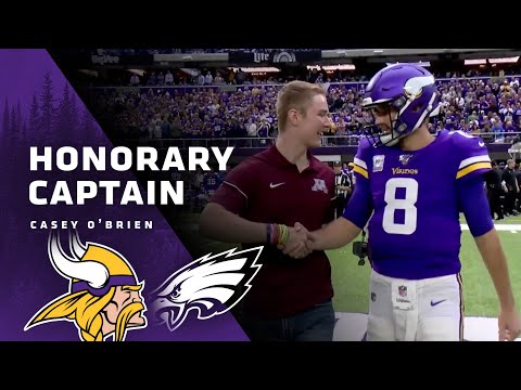 Sunday’s Honorary Captain was four-time cancer survivor Casey O’Brien. The St. Paul native was diagnosed with osteosarcoma for the first time at age 13. The desire to play football again motivated O’Brien at every stop of his journey from his time at Cretin-Derham Hall and now as a walk-on placeholder at the University of Minnesota. O’Brien delivered the keynote speech at this year’s Big Ten Football Kickoff Luncheon after connecting with Minnesota Vikings QB Kirk Cousins, who had previously spoken at the event. Cousins’ father is a cancer survivor. #MinnesotaVikings #Vikings #NFL